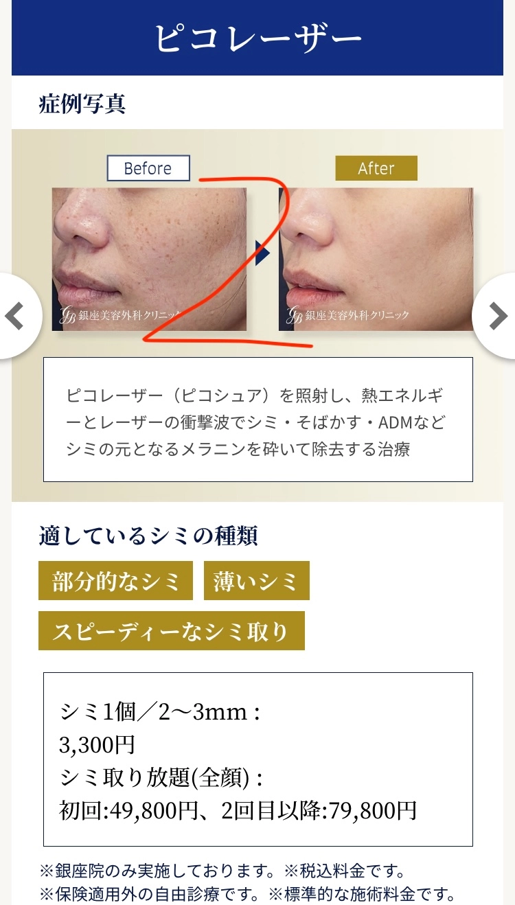 | 治療費用 | 【通常料金】 ・第一本番シミテキストです(1個):¥3,300/1回 ※直径3mmまでの第一本番シミテキストですに適用される1個あたりの料金となります ※医師の処置料として別途¥2,200を頂戴いたします ・第一本番シミテキストです(肝斑部分):¥158,000/12回(コース) |